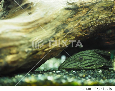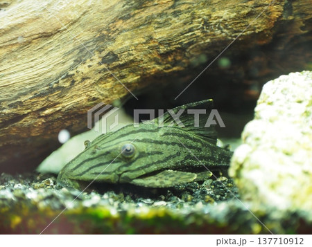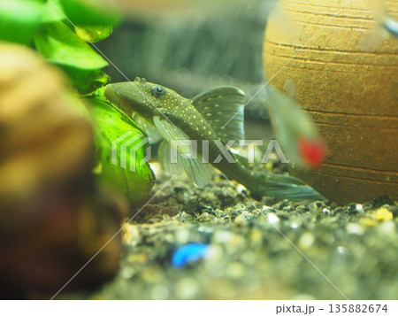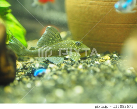 一條斑點異型魚趴在魚缸底部的底砂上休息(熱帶魚/魚缸)