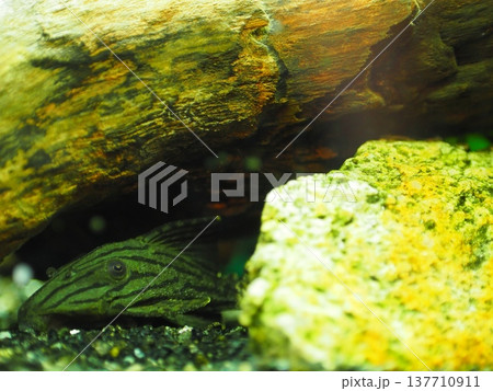 水族箱裡的迷你濃密異形魚被浮木捕獲