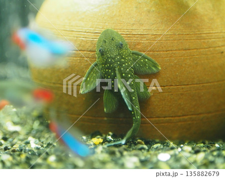 藍鰭佩喬萊蒂亞魚依附在陶土管上