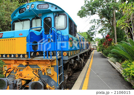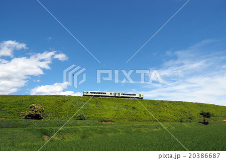 清新的綠色山脈和火車的自然風景。日式簡單的背景插圖。