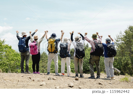 一群人從小孩到老人沿著山路行走的庫存插圖素材