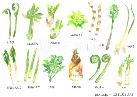 [水彩畫]漏勺上的5種春季野生植物植物成分材料白色背景PNG可複制空間