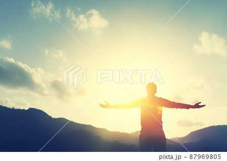 Copy space of man hand raising on top of mountain and sunset sky abstract background. Freedom travel adventure and business victory concept.