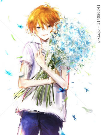 微笑的男孩拿著一束鮮花