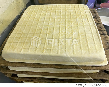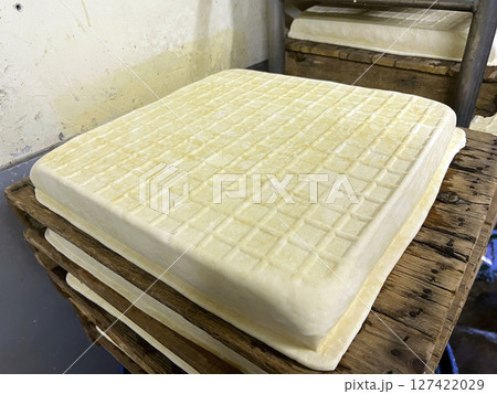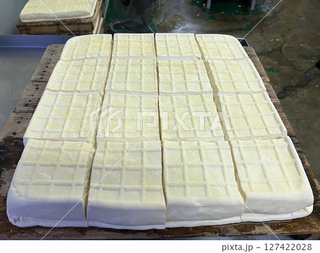 在傳統豆腐店裡拍攝剛製作好的豆腐