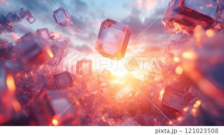 A surreal electric guitar surrounded by vivid pink and teal glitch textures, blending music with abstract digital chaos