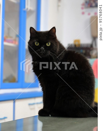 老黑貓坐在桌子上,証明牠才是這個家的主人