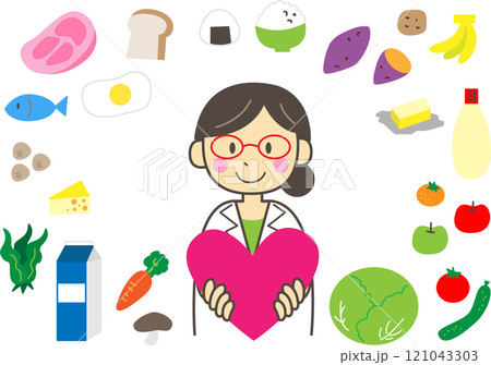 穿著白大褂的女人拿著一顆心和各種食物