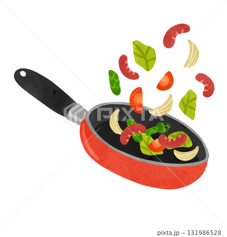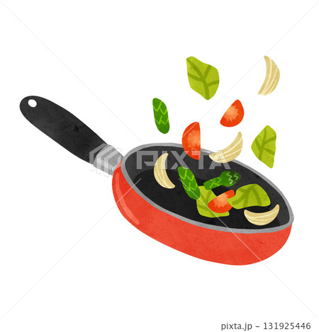 橘色煎鍋和炒蔬菜水彩手繪插畫