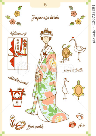 新娘和新郎穿著白帽和鳳頭袴,舉行婚禮,附物品說明