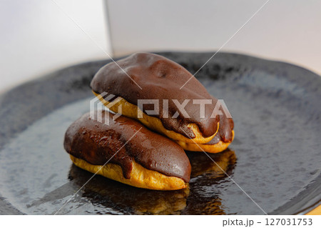 一款外型類似閃電泡芙的奶油泡芙,外層裹著巧克力,裡面填滿了巧克力奶油。