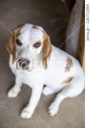 small cute beagle puppy dog looking up