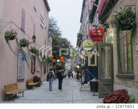 Quebec, Canada - October 20 2021 : Quebec City Old Town street view in autumn season. Place Royale. Rue Notre-Dame.