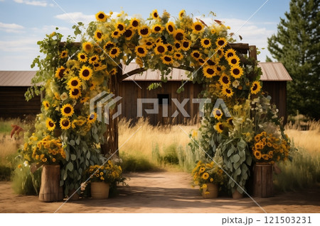 A vibrant sunflower archway in a serene outdoor setting, creating a joyful atmosphere for events and celebrations.