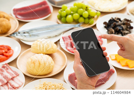 一位中年婦女一邊看著各種食材和她的智慧型手機,一邊憂心忡忡。