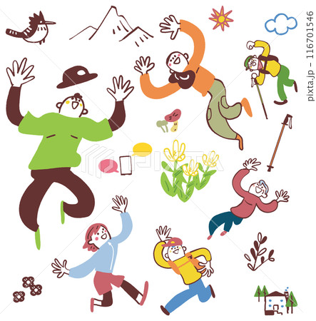 令人興奮的登山 — 一群家庭和一對老年夫婦在空中跳舞和享受登山的庫存插圖