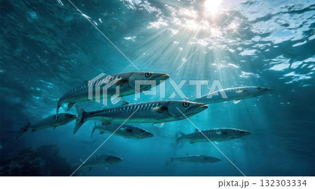 School of barracuda fish swimming underwater with sunlight rays penetrating crystal clear ocean water