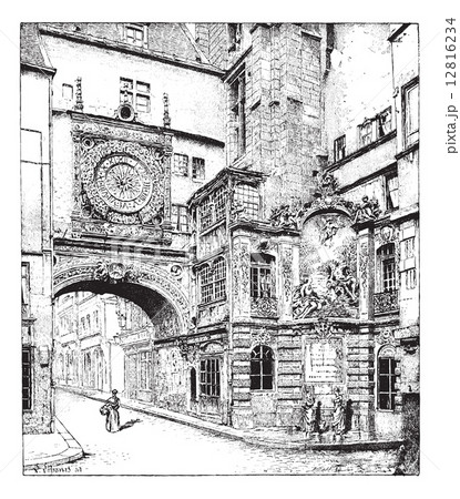 Rouen, the big clock, Normandy, France, vintage engraving.