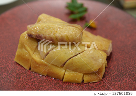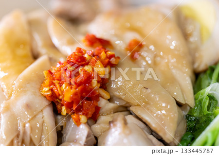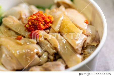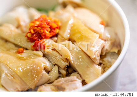 台灣傳統美食,鮮嫩雞肉飯搭配滷汁與辣椒
