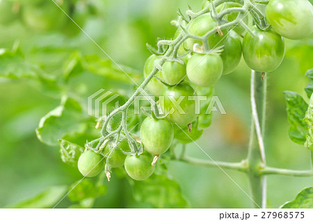 Tomatoes. Ripened scarlet tomatoes on a branch in the greenhouse
