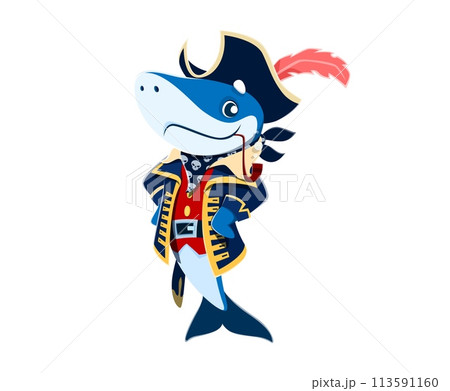 Cartoon shark animal captain or pirate corsair character with smoking pipe, vector funny sailor. Shark captain in pirate tricorne hat and sailor skull bandanna for kids Caribbean pirate character