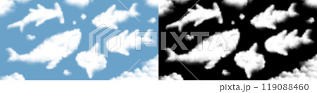 Marine animals and aquatic life set funny imagination whale, great hammerhead, shark, sunfish, mola mola, fish, bubble from Cloud or smoke patterns illustration isolated floating blue sky background