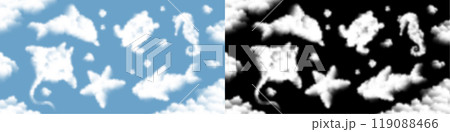 Marine animals and aquatic life set funny imagination stingray, ray, dolphin, turtle, seahorse, starfish, shark, bubble from Cloud or smoke patterns illustration isolated floating blue sky background