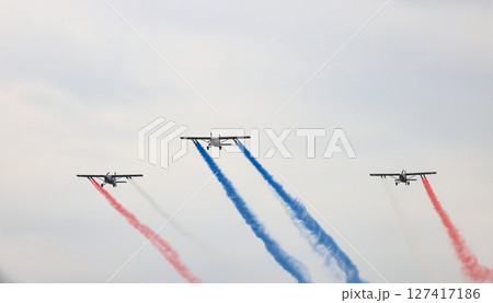 Fairchild AU-23 Peacemaker Armed gunship, counter-insurgency, utility transport aircraft on formations with colorful smokes venting from the plane.