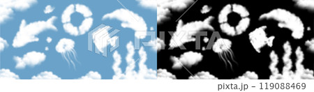 Marine animals and aquatic life set funny imagination shark, fish, dugong, manatee, lifebuoy, seaweed, jellyfish, bubble from Cloud or smoke patterns illustration isolated floating blue sky background