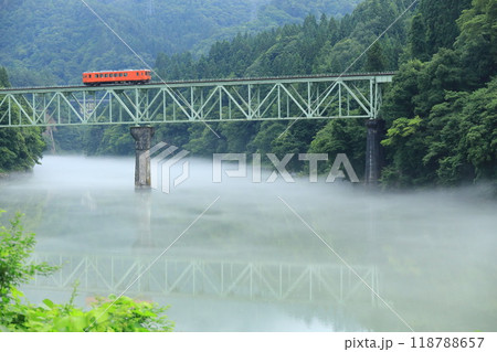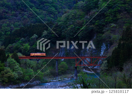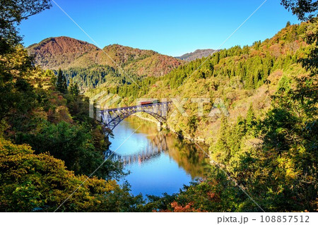 只見線 - 秋季穿越第一隻見川大橋的列車(福島縣三島町,10月下旬下午)