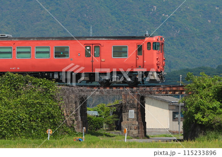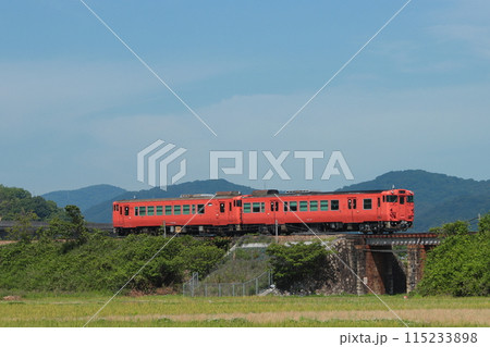 溫暖的秋日,一列播但線柴油列車穿過下市川大橋。
