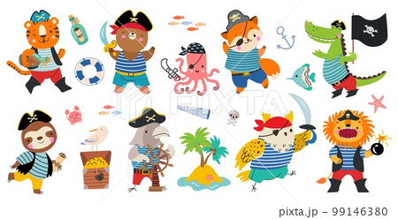Pirates cartoon characters, happy animal in pirate costume. Isolated cute animals, fun captain, island and chest with treasure. Nowaday sailor vector set