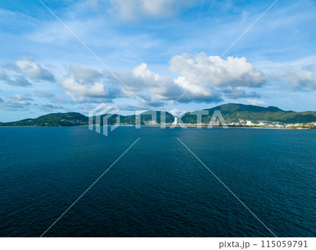 Aerial view seashore with mountains at Phuket Thailand, Beautiful seacoast view at open sea in summer season, Nature recovered Environment and Travel background
