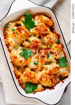 baked cauliflower, in cream sauce, with cheese and spices, homemade, no people,