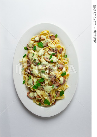 fettuccine with champignons, basil, in cream sauce, homemade, no people,