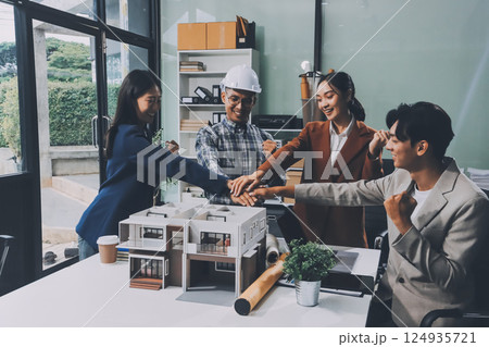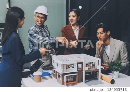 Construction, planning and architects meeting about design of building, strategy and working in industrial collaboration. Architecture workers talking about maintenance project with paper and a model