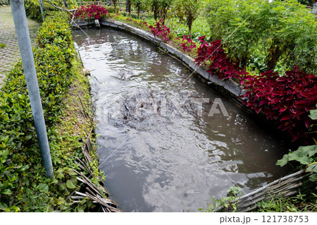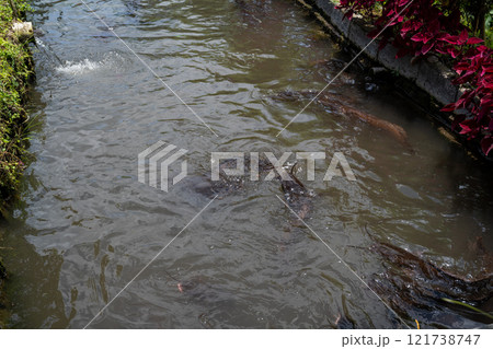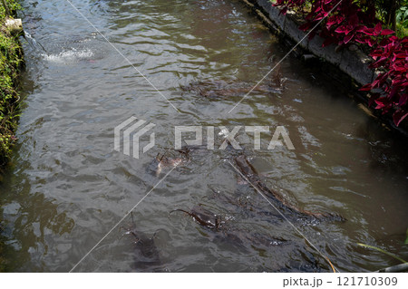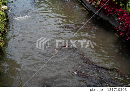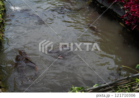 印尼峇裡島 — 2024年10月22日:黑色背景鯰魚池照片。
