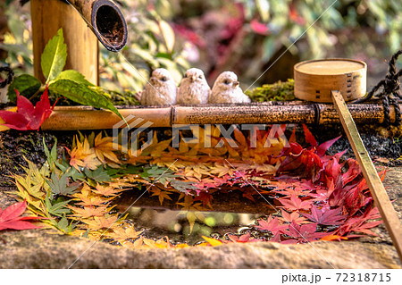 站在水盆中的雜色山雀,伸開雙腿,眺望遠方(多喜尾神社的雜色山雀)