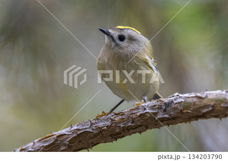 Goldcrest perched on a branch in the forest during morning light in Europe