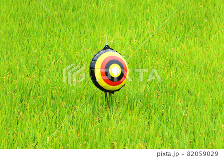利用安裝在稻田中的驅鳥風箏來預防鳥害的圖片素材。