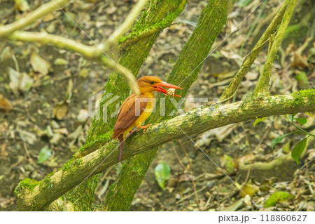 赤松樹在樹蔭下吃他最喜歡的螃蟹