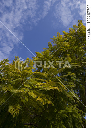 藍天白雲下,藍花楹樹的綠葉閃閃發光,它的學名是藍花楹。