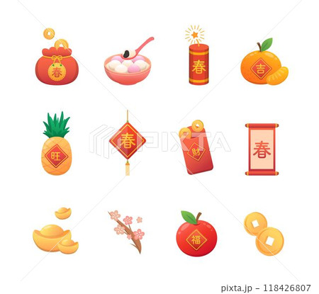一組中國新年或元宵節的向量插畫,可愛多彩的風格