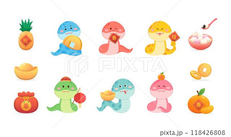 蛇角色或卡通人物與中國新年或元宵節的向量插畫,湯圓與錢袋