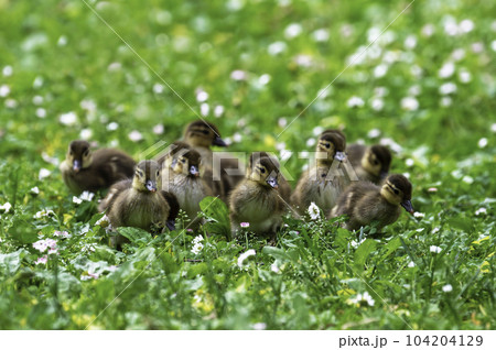 初春湖面:綠頭鴨、鴛鴦落在鬆開的冰凍湖面上