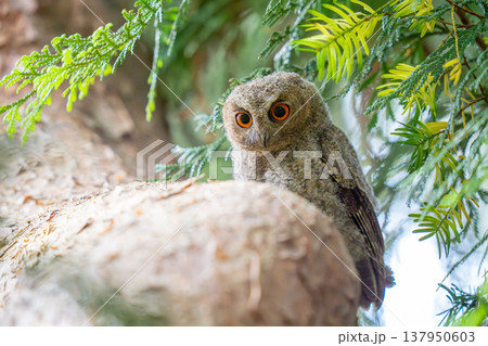 一隻剛離巢不久的東方角鴞幼鳥正在觀察周圍的環境。