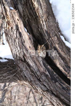 一隻西伯利亞貓頭鷹捕到獵物後棲息在樹枝上。