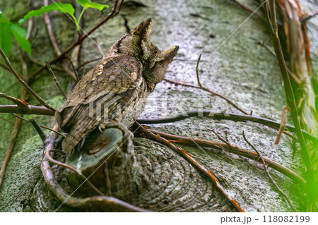 藍翅貓頭鷹棲息在樹枝上小憩