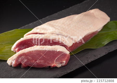Fresh raw duck breasts, on a wooden chopping board, with herbs and spices, on a white background, no people