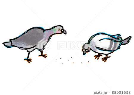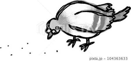 帶有白色框架的透明背景插圖,其中一隻面向左側的岩鴿蹲伏著吃食物。